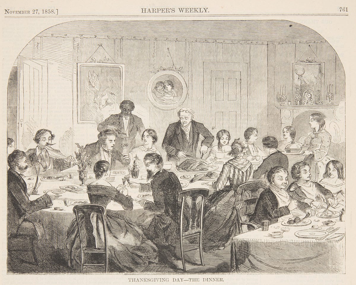 Winslow Homer, “Thanksgiving Day — The Dinner”, wood engraving in black ink on paper, printed in Harper’s Weekly, November 27, 1858, from the Smithsonian Open Access collection.